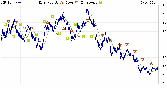 With that out of the way, JCP rallied quite a bit today, jumping 16.25% to $9.73, its highest close since about November, on a favorable earnings report last night. Sales growth topped estimates and the losses were narrower. See this press release for the overview: http://www.marketwatch.com/story/jcpenney-reports-fiscal-2014-first-quarter-results-2014-05-15